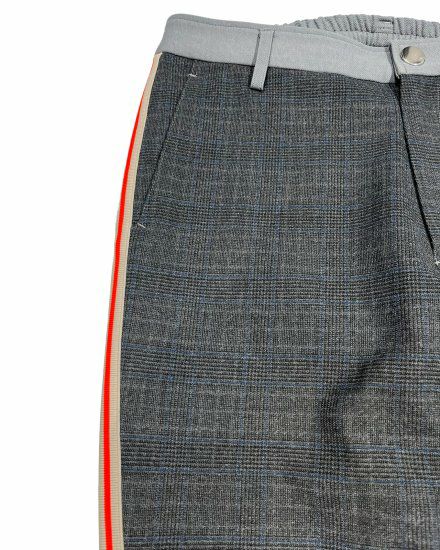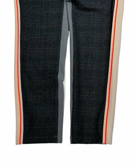 グレンチェックのコンビネーションバイカラーパンツ。