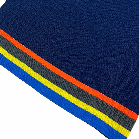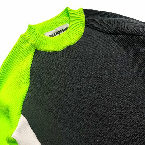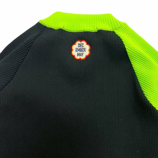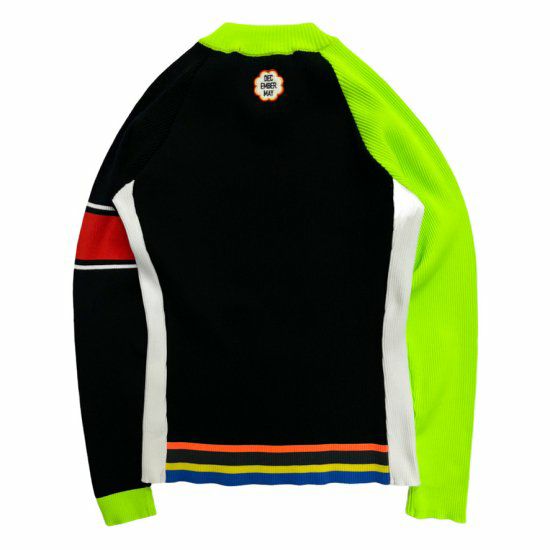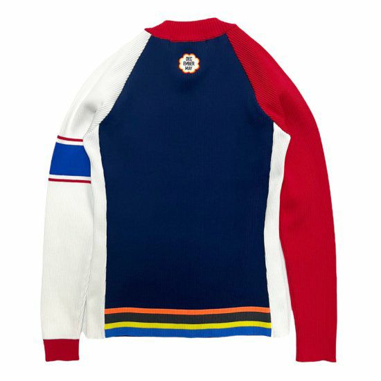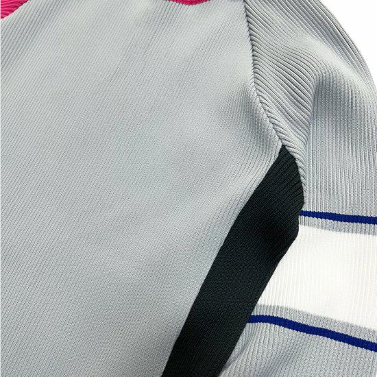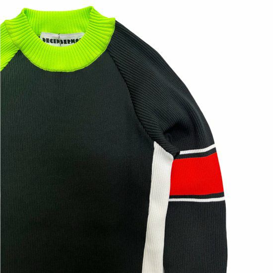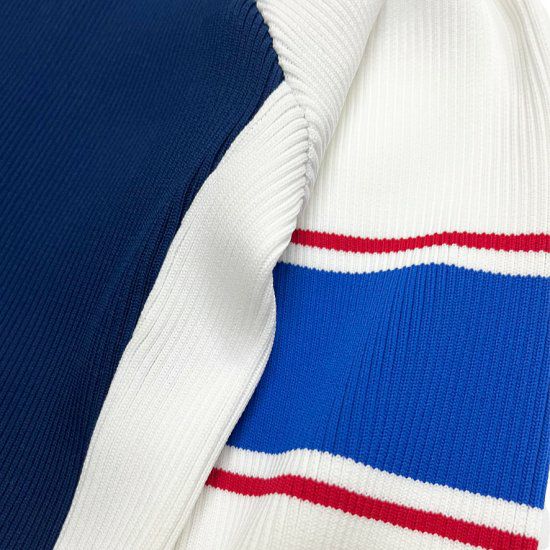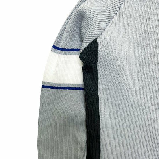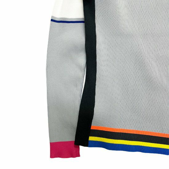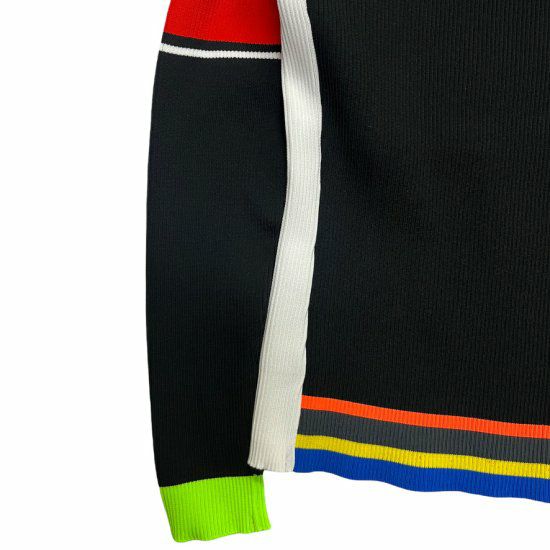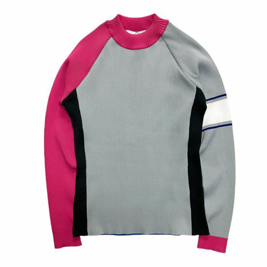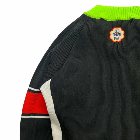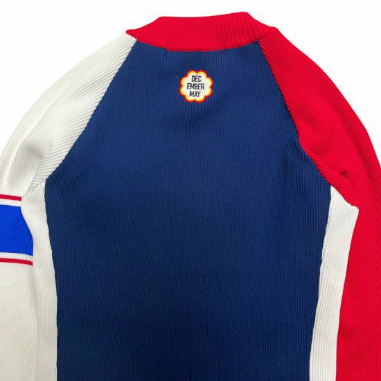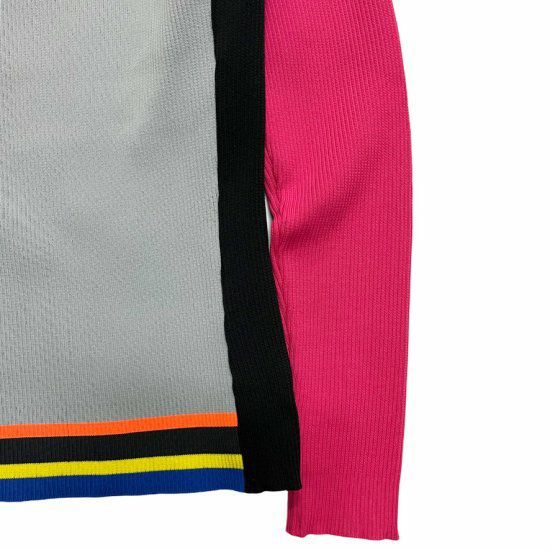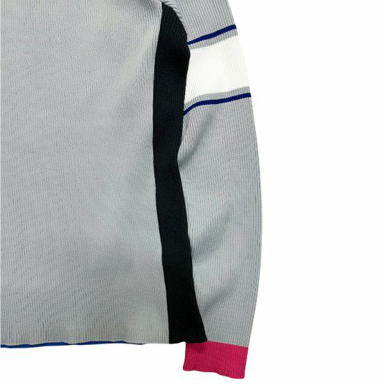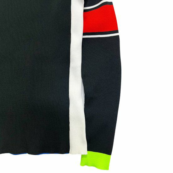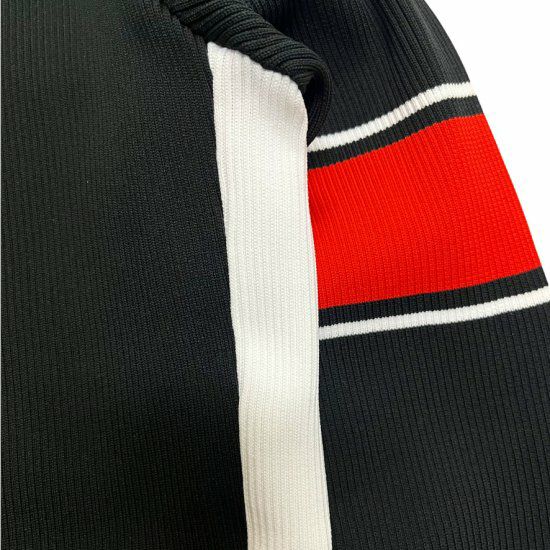 アクセントの効いたデザインで、左右非対称の配色と袖のラインがポイントです。