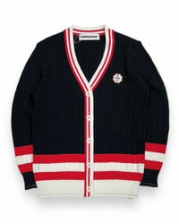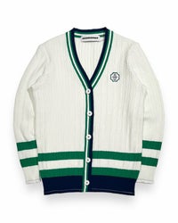 OLD SCHOOLなテイストを最新のエコ素材で編み上げたカーディガン。